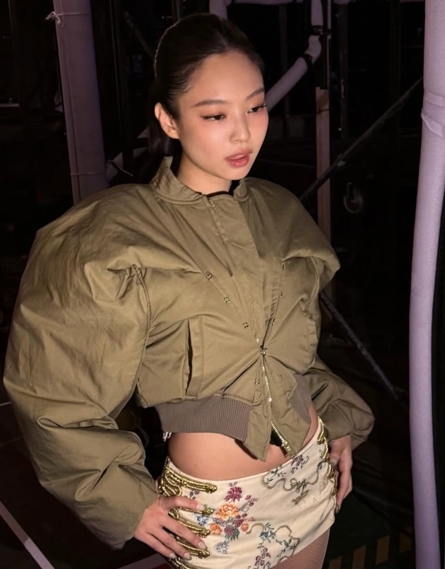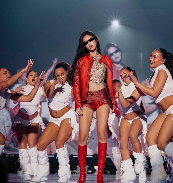 무대 조명 아래에서 반짝이는 디테일과 백댄서 의상과의 대비가 제니의 존재감을 더욱 돋보이게 했습니다.