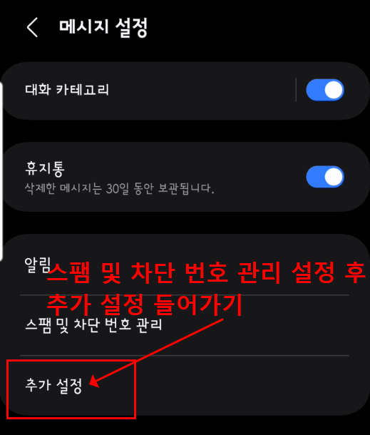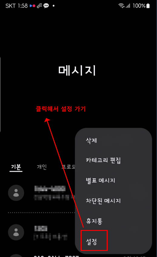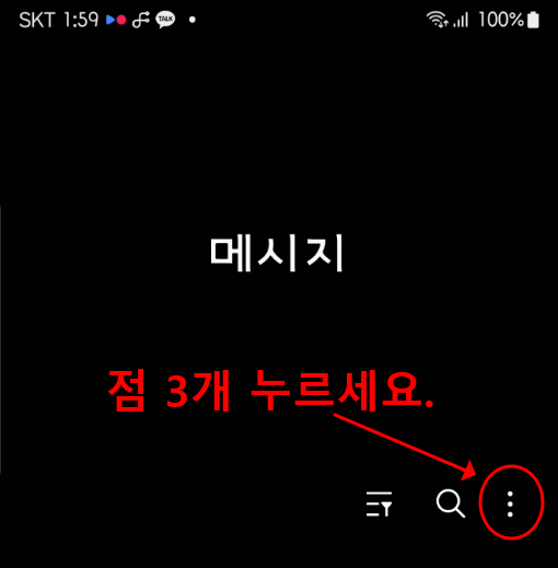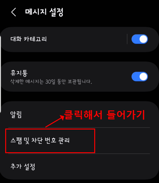 이제 메시지 앱 설정으로 이동해 보세요. 우측 상단 점 세 개 메뉴 > 설정 > '스팸 및 차단 번호'로 들어갑니다.