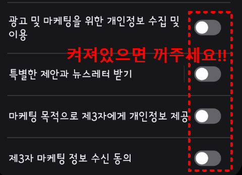 ‘개인정보 처리 방침’ 항목에 들어가면 보통 4개 정도의 동의 항목이 켜져 있습니다.