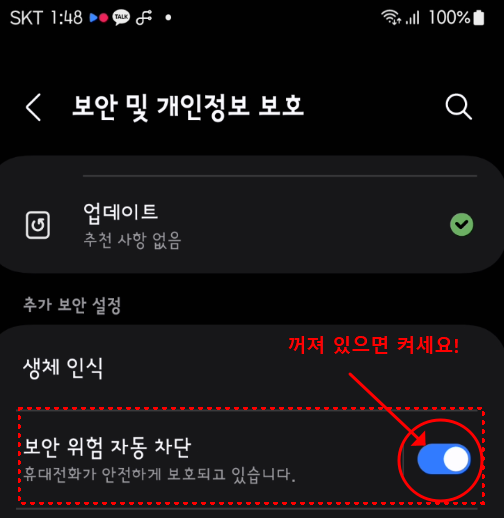 스마트폰의 설정 > 보안 및 개인정보 보호 메뉴로 들어가 보세요. 여기서 '보안 위험 자동 차단'을 활성화할 수 있습니다.